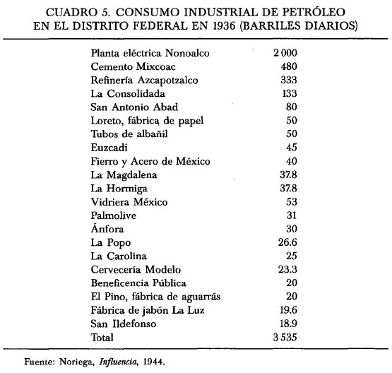 Como hemos visto, existen varios indicadores que muestran que la ciudad de México fue la zona de mayor consumo de petróleo en el país. Por una parte, esta ciudad se consolidó como centro de la red carretera y ferrocarrilera nacional. También fue muy importante la construcción, en 1932, de la refinería de Azcapotzalco que, junto con su oleoducto, convirtió a la ciudad de México en la principal receptora de petróleo en el mercado nacional. Ciertamente el interés de las empresas petroleras de hacer esta obra de infraestructura fue cubrir la demanda de la principal ciudad del país. En ese entonces la ciudad contaba con un poco más de 1 000 000 de habitantes y concentraba 27.2% de la producción industrial nacional.54 Además de los transportes, ferrocarriles y automóviles, la industria fue el principal consumidor de productos derivados del petróleo, por lo que su disponibilidad fue un factor de atracción estratégica para la localización de diversas empresas industriales. Para 1936 una variada gama de industrias consumía petróleo (véase cuadro 5); entre estas destacaban una planta eléctrica, una productora de cemento y la misma refinería de Azcapotzalco. Por ello, y a medida que la ciudad de México continuaba su acelerado proceso de industrialización y crecimiento poblacional, las instalaciones de esta refinería se fueron ampliando y modernizando. Para 1936 tuvo una producción de 763 354 metros cúbicos de derivados del petróleo, ocupando un cuarto lugar en cuanto a producción, después de las grandes refinerías de Tampico y Minatitlán, de la compañía El Águila, y la de Tampico, perteneciente a la Huasteca Petroleum.55