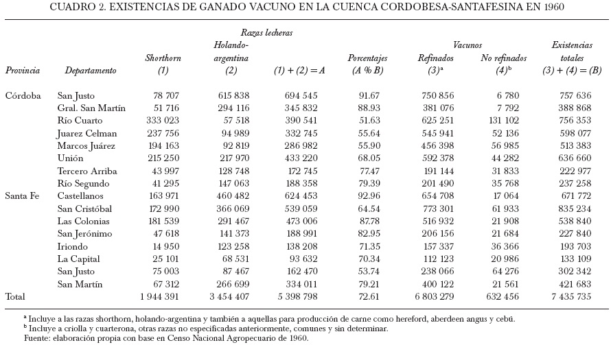 Para 1960 la situación de la cuenca ha cambiado sustancialmente.38 La cuenca se ha ampliado territorialmente hacia el sur santafesino y el sureste cordobés. Las existencias ganaderas se han incrementado desde 1 869 971 cabezas en 1937 a 7 435 735 vacunos en 1960, es decir, casi cuatro veces. Las razas holando-argentina y la shorthorn han alcanzado amplia difusión en el conjunto de los departamentos de la cuenca. El índice de refinamiento lechero ha trepado de 0.45 a 72.5% durante 1937-1960 (cuadro 2). Este índice está mostrando que ya no conviene más tener un rodeo criollo y que, probablemente, otro conjunto de indicadores de productividad se hayan elevado en los tambos. Si se compara la proporción de ganado refinado total con la de ganado específicamente lechero, se puede apreciar que si bien la presencia de las razas hereford y aberdeen angus se han incrementado, las razas lecheras lo han hecho en una proporción muchísimo mayor. Los guarismos sobre fuertes incrementos ganaderos y de razas lecheras durante 1937-1960 hablan de un proceso de especialización láctea en curso.