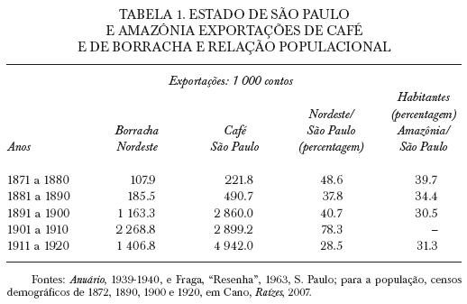 No sentido de poder avaliar qualitativamente o potencial econômico dessa atividade, comparo-a com a expansão cafeeira em São Paulo, no período de 1870 a 1920. Vejamos o confronto das exportações paulistas de café e das de borracha pela Amazônia, assim como o de suas respectivas populações (ver tabela 1).