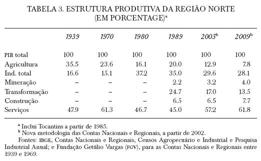 Um balanço muito geral do período 1939-1970 mostra, para a região Norte, os seguintes resultados: pequena recuperação em sua participação no produto interno bruto (PIB) nacional em relação aos baixos níveis vigentes entre 1949 e 1960; aumento em sua participação no PIB agrícola nacional graças à sua integração com o mercado nacional; pequena perda de participação no PIB nacional do setor serviços, certamente devida à sua precária urbanização; embora a estrutura produtiva de sua indústria de transformação pouco mudou, sofreu pequena perda de participação no PIB nacional do setor, devido a que entre 1939 e 1949 a região também se beneficiou do efeito da industrialização nacional, tendo sido sua taxa média anual de crescimento do setor de 4%, mas inferior às do Brasil (7.8%) e de São Paulo (9.8%); mas a partir do momento em que sua integração com o mercado nacional cresce, sua taxa se acelera (entre 1949 e 1970) para 8.8%, muito próxima às do Brasil (8.3%) e de São Paulo (9.2%), mostrando, no fim do período (1967-1970), os primeiros efeitos positivos da Zona Franca de Manaus (ver tabela 2).