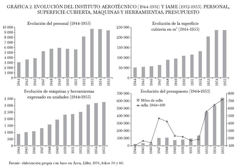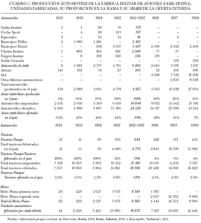 Para desarrollar este artículo, me he valido de la utilización de fuentes primarias como el Libro histórico, 1926-1976, del Área de Material Córdoba; la Reseña histórica de la Dirección Nacional de Fabricaciones e Investigaciones Aeronáuticas en su 40 aniversario de 1968; las Actas de Directorio de IAME, de abril de 1956 a febrero de 1957,4 y las Memorias y balances generales de la Dirección Nacional de Fabricaciones e Investigaciones Aeronáuticas (Dinfia) correspondientes a los ejercicios económicos de 1957, 1960-1961, 1962-1963 y 1965. He procedido a la búsqueda de fuentes directas internas de IAME durante el peronismo (1952-1955) en los principales reservorios de documentación aeronáutica como la Biblioteca Nacional de Aeronáutica o la Dirección de Estudios Históricos de la Fuerza Aérea Argentina, así como también en el Departamento del Archivo Intermedio del Archivo General de la Nación, el cual alberga los fondos documentales de los organismos del Estado. Como ha sucedido a investigadores anteriores, no he podido encontrar la documentación oficial de la Fábrica Militar de Aviones referida en el periodo en cuestión,5 quedando como sustituto imperfecto pero como publicación oficial de este periodo la Revista Nacional de Aeronáutica, con su detallada descripción de las novedades en torno a cada una de las actividades de Industrias Aeronáuticas y Mecánicas del Estado.