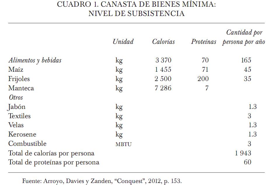 El cuadro 1 muestra los bienes incluidos en la canasta de subsistencia. De acuerdo con sus creadores, Allen et al., la elección de una canasta de subsistencia mínima obedece a distintos niveles y costos de vida en el mundo. La canasta inicial creada por Allen para Inglaterra resultaba muy onerosa para países en vías de desarrollo. Para hacer esta canasta más acorde con las realidades de estos países, los autores redujeron el consumo de los principales bienes. Comprende dos grupos de bienes en general: alimentación y otros. En el rubro de alimentación se computa una canasta de 1 940 calorías y 60 gramos de proteínas diarias con una dieta de frijoles con una pequeña porción de carne suplementado con el carbohidrato de preferencia. En este caso utilizamos el maíz. Adicionalmente, en el rubro de otros se incluyen otros bienes no alimenticios tales como velas y combustible. Puesto que esta canasta especifica las cantidades de cada uno de estos ítems, es posible calcular el costo en moneda local de la misma. El costo de vida para una familia tipo de cuatro personas se estima multiplicando el costo de la canasta por tres, ya que se asume que de una familia de cuatro, dos son menores que consumen en conjunto el equivalente a un adulto. Como se ha construido de manera consistente con la metodología de Allen et al., se podrá realizar una comparación del bienestar económico con otras ciudades en el mundo.