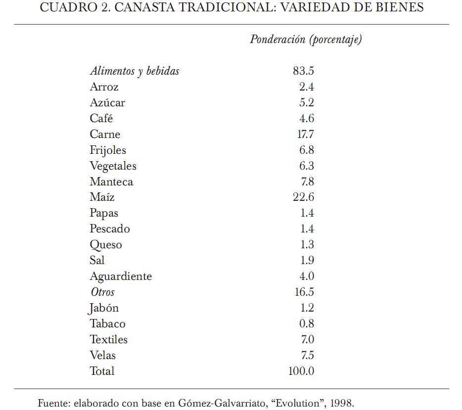 La segunda canasta es más tradicional ya que incluye artículos más variados por ejemplo distintas proteínas y bebidas alcohólicas como el aguardiente. Adicionalmente, esta canasta utiliza ponderaciones relativas por tipo de bien de consumo sumando en su totalidad 100% (véase cuadro 2). Para facilitar la comparación con la canasta de subsistencia, se han clasificado los bienes en rubros similares: alimentación y bebidas, y otros. La composición relativa es 83.5% en alimentos y bebidas y el resto en otros. A simple vista, se aprecia que la cantidad de bienes incluidos es mayor que en la canasta de subsistencia. Esta estimación está basada en presupuestos de familias de obreros en México, tal como lo cita su autora Gómez-Galvarriato.8 La consulta de fuentes secundarias ha provisto información sobre el contenido de la canasta de consumo venezolana y, consecuentemente, se ha adaptado el presupuesto teniendo en consideración los patrones de consumo en Venezuela y según la disponibilidad de datos. Por ejemplo, se ha notado que la canasta de consumo popular del venezolano era primordialmente carne, lácteos y granos. En términos de bebidas alcohólicas, el aguardiente reemplaza al tradicional vino y a la cerveza, que son comúnmente utilizados en los presupuestos en los países europeos.9