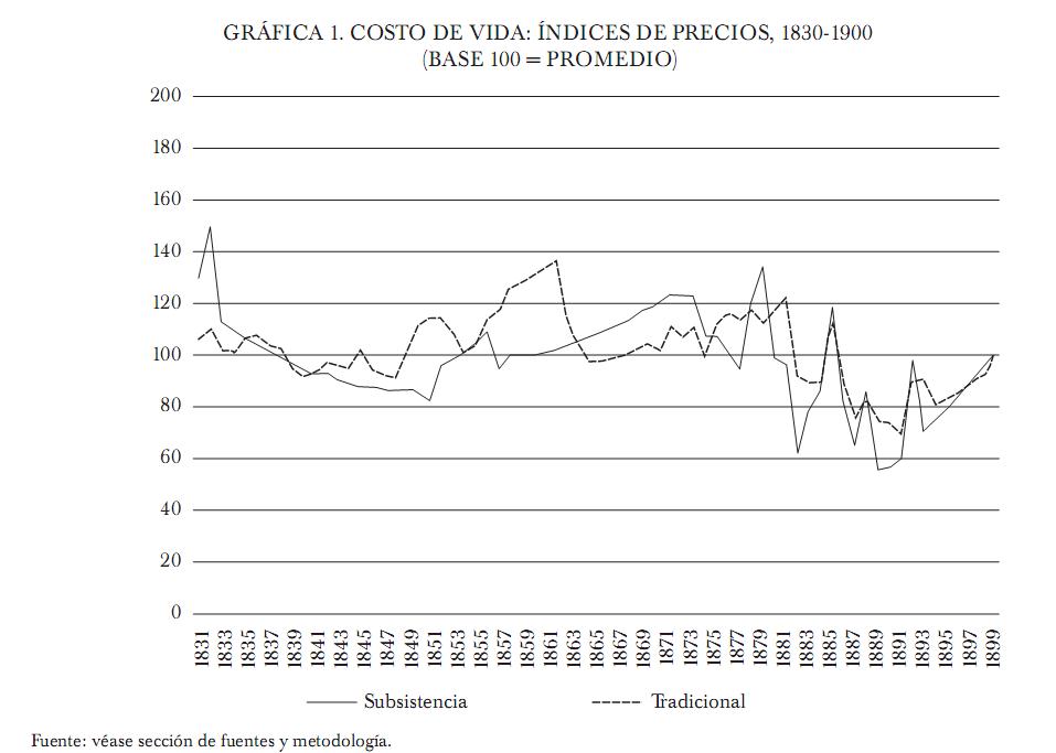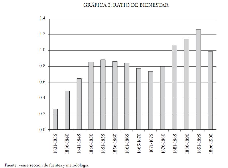 Tal como se ha comentado en la sección de contexto histórico, en las décadas de 1870 y 1880 se logró mayor estabilidad política y junto con la entrada de capitales del exterior se impulsó la actividad económica, en particular por parte del gobierno. Es durante estas décadas que se observa un incremento sustancial del bienestar que trepa a niveles superiores a 1.2 en la primera mitad de la década de 1890. Esta tendencia alentadora es interrumpida a fines de siglo con una caída a niveles de subsistencia. Esta reversión se debe a un aumento del costo de vida de subsistencia.