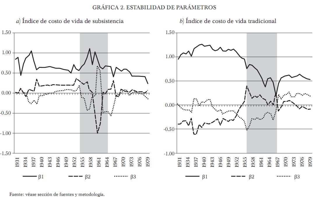 . Dada la volatilidad de las series es razonable que los coeficientes no sean sumamente estables. Sin embargo, es posible identificar un periodo en particular en que los parámetros varían significativamente. En principio, desde fines de 1850 hasta mediados de 1860, los parámetros son inestables y sólo se normalizan hacia 1870. Este comportamiento de los parámetros es común a ambos índices de costo de vida. La gráfica 2 presenta los coeficientes en esta estimación recursiva con una ventana de 20 periodos, incluyendo zonas sombreadas en las que los coeficientes presentan cambios considerables.