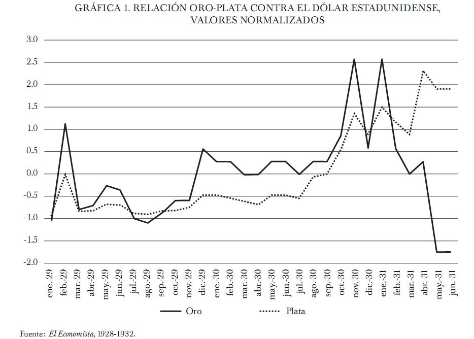 La relativa constancia del peso plata se explicaba en parte por un ciclo más largo de descenso (al que respondía su sustitución) y porque siendo un proceso mejor conocido las autoridades la intervenían periódicamente.19 Pero esa tendencia se oscurecía al combinarse con la preferencia áurea de los agentes. Preferencia que, como advertimos, se contrarrestó por la decisión inglesa, la formación de un bloque panamericano, el Acuerdo de Londres de 1933 y el Acta roosveltiana de compras de plata de 1934, que la rehabilitaron monetariamente. La aversión al riesgo había encontrado su asidero en el oro pero el final de 1931 convocó una contramarcha y para el mercado mexicano un inesperado vuelco. No obstante que los juicios sobre la plata no siempre fueron certeros, las nuevas circunstancias justificaron a quienes observaban que la inestabilidad embozaba una relativa constancia de la plata. La gráfica 1 muestra el comportamiento de ambos metales, suavizada por su expresión en unidades de desviación estándar (eje Y), y ayuda a apreciar la tendencia señalada (lo hace porque muestra el comportamiento estadístico de los metales al remover otras unidades o magnitudes que pudieran ensuciar la trayectoria. Es decir, omite otros valores para mostrar en forma pura el comportamiento estadístico de la serie, pues de otra forma se generarían índices y se perdería la estructura de la formación del precio y, con ello, poder descriptivo). Es improbable que las autoridades hicieran este ejercicio pero no hay duda de que comprendían contra el sentido común la relativa constancia del peso plata. De aquí partía su idea de intentar estabilizar en una paridad moderadamente cercana puntos de equilibrios de 1930.