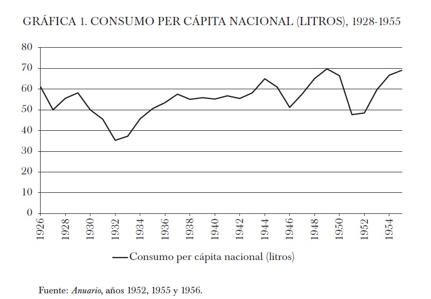 Durante los dos primeros años de la década, el consumo cayó de 58 a 34 litros (véase gráfica 1). Preocupada por la situación, la entidad desplegó una fuerte campaña publicitaria sobre las bondades del vino para el fomento del mercado interno, para contrarrestar la desconfianza en su calidad, la competencia de la cerveza, los altos precios y la campaña contra el alcoholismo.48 Se preocuparon también por el incentivo a la exportación, mostrando detallados análisis de los mercados de Estados Unidos, Brasil y Holanda e incluso hasta de champagne a Cuba.