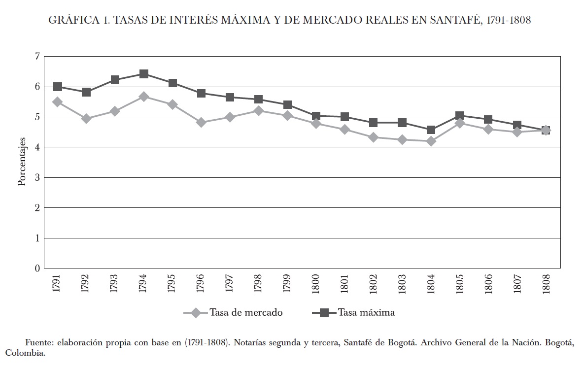 Este vacío no se trata, por cierto, de una traducción de la ausencia de investigaciones empíricas concretas. Por el contrario, se debe a la hipótesis aún por demostrarse de que en realidad el crédito por los comerciantes fue marginal, que su capacidad de dinamizar la economía colonial fue reducida y, como corolario, que no se puede hablar de un incipiente mercado de capitales (Romano, 1997, 2004), esto último agravado por la política religiosa de control de las tasas de interés y por la restricción de la entrada y salida de los agentes a este tipo de transacciones. Esta hipótesis, sin embargo, ha sido puesta en duda. En un estudio de las finanzas del virreinato de Nueva España y su influjo en la estructura del imperio español, Carlos Marichal (1997, 1998) afirmó que “hacia fines de la colonia efectivamente existía un sistema crediticio y un mercado de capitales complejo y relativamente exigente”. Además, es importante puntualizar que el hecho de que los precios de ese mercado tuvieran un tipo máximo fijado por las autoridades no significa que no exista ese mercado. La coordinación de ese mercado de capitales se puede seguir en la época moderna a través de los comerciantes, quienes son los que tenían mayor capacidad de ahorro (Bordo y Cortés, 2001). Así, buscamos aportar a la discusión analizando con relativo detalle el mercado de la capital neogranadina, ciudad que entró en una importante expansión por el crecimiento de su población y por sus particulares funciones en la distribución de mercancías e importancia política.