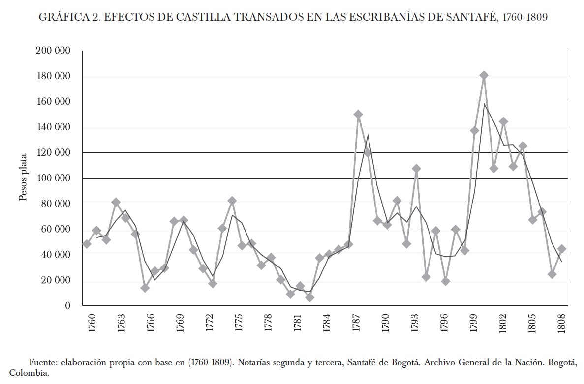 Iniciemos con el comportamiento en el mercado de efectos de Castilla (véase gráfica 2). Entre 1760 y 1809 pasaron por las notarías de Santafé un total de 3 036 271 pesos plata en efectos de Castilla vendidos a crédito. Se trata de una fracción ciertamente menor si la comparamos con la evolución de las alcabalas, que es el indicador más sólido de ventas totales de este bien en el mercado; el recaudo constituía 2% del valor de avalúo de las mercancías (Muñoz, 2010). Aunque en términos absolutos la diferencia es abismal, pues las alcabalas informan de transacciones totales hasta de 1 000 000 de pesos anuales, la tendencia es similar. Además, insistamos en que las notarías nos proporcionan una serie de variables ausentes en las fuentes alcabalatorias como la tasa de interés y los plazos del crédito.
