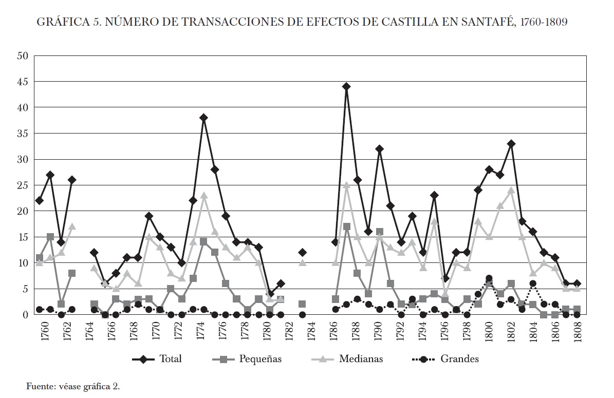 Iniciemos una vez más por el mercado de efectos de Castilla. Hemos dividido el mercado en tres tipos de transacciones: pequeñas, que comprenden el intervalo de transacciones de 0 a 999 pesos; medianas, que abarcan aquellas entre 1 000 y 9 999 pesos; grandes, que corresponden a todas aquellas mayores a 10 000 pesos. Aunque se trata de una división artificial, nos permitirá observar el comportamiento segmentado del mercado y su grado de concentración. Además, nos hemos guiado por los montos establecidos por el consulado de Cartagena para la clasificación de sus miembros (Múnera, 1998).