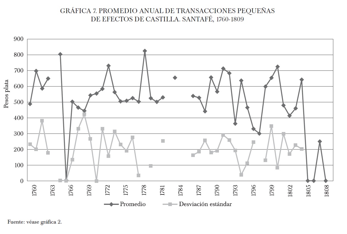 En ese sentido, en el presente artículo estudiamos el crédito otorgado por los comerciantes de Santafé de Bogotá examinando el comportamiento del mercado monetario y el mercado de efectos de Castilla durante la segunda mitad del siglo XVIII.1 Para ello, hemos construido series de tasas de interés y de préstamos en moneda y efectos de Castilla otorgados por comerciantes residentes y sedentarios en las notarías de Santafé entre 1760 y 1810. Los comerciantes sedentarios son aquellos que tienen su centro de operaciones en la ciudad de Santafé y los residentes son aquellos que están temporalmente en la ciudad. Por otra parte, es importante recordar que en Santafé no había una distinción marcada entre mercaderes y comerciantes, de hecho, el Plan de una compañía patriótica de comercio (1801) señala que “se echa de menos el contraste entre los que aquí se pueden llamar comerciantes, y los que comúnmente son conocidos con el nombre de mercaderes” (p. 107).