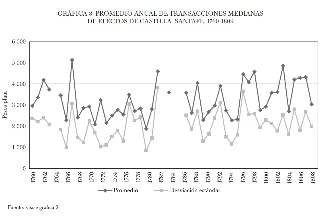 Ahora bien, ¿qué posibilitó que estas variables en el mercado metálico hayan mejorado a fines del periodo colonial? La respuesta no es fácil y sólo podemos ofrecer unas hipótesis preliminares. La primera nos conduce sin duda a las instituciones. En los últimos años existe una importante tradición historiográfica que ha hecho énfasis en las “reglas de juego” para explicar el crecimiento económico (Coatsworth y Tortella, 2007; North, 1983). En Colombia este enfoque ha sido remarcado por Salomón Kalmanovitz (2010). En el caso del sector comercial, el desarrollo de instituciones como el consulado y sus antecedentes habría disminuido el riesgo y los costos de transacción (Hausberger e Ibarra, 2003). En el caso neogranadino, es importante analizar el impacto del Tribunal de Comercio, primero, y del Consulado después (Lucena, 1986). No nos referimos al influjo de inversiones que desarrolló el consulado en donde existe un debate muy parcial sobre su fracaso o éxito (McFarlane, 1983; Múnera, 1998). En cambio, sí aludimos a la necesidad de establecer su impacto en la protección de los derechos de propiedad y la agilidad en el arbitraje de los pleitos.