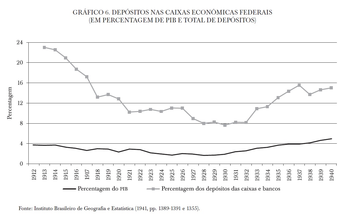 As caixas econômicas públicas foram importantes na captação de depósitos desde a sua criação a partir de 1861 pelo governo imperial e posteriormente pelos estados. Embora a maior parte dos habitantes morasse no campo, as principais capitais provinciais e depois estaduais realizaram elevada proporção de cadernetas de poupança e depósitos em relação à sua população. De forma semelhante, os depósitos das Caixas representaram parcela relevante dos depósitos bancários, comparativamente aos do Banco do Brasil que se expandiram expressivamente nas primeiras décadas do século XX. Após um período de estagnação, a crise dos anos 1930 e a reorganização das Caixas possibilitaram a retomada do crescimento dos seus depósitos.