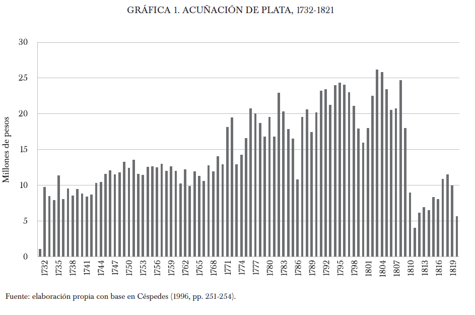La Real Casa de Moneda de México acuñó la cuantiosa producción minera del virreinato novohispano, respaldó las siempre exhaustas finanzas reales y generó el vasto caudal monetario que fluyó por los canales mercantiles del naciente capitalismo. En el siglo XVIII desplazó a la ceca potosina, en el virreinato peruano, como la mayor productora mundial de moneda, y el peso de a ocho mexicano llegó a ser el circulante más y mejor aceptado en las transacciones internacionales (Romano, 1998; Valdéz, 1987).
