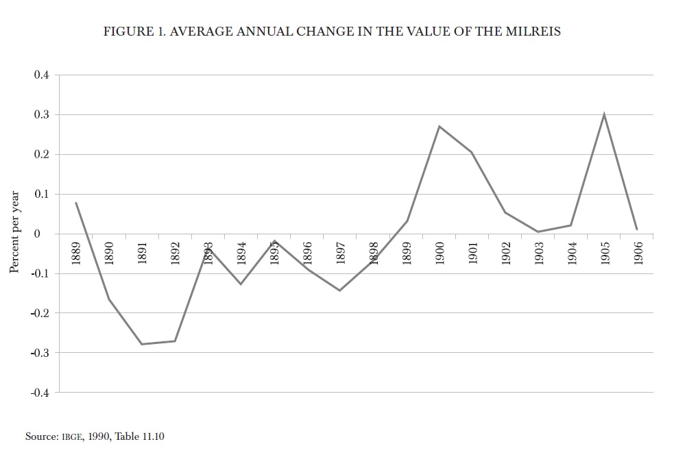 The expansion of banking and the number of banks authorized to issue notes, together with the other policy changes designed to liberalize the financial system had several negative consequences. First, it led to a nearly 300% expansion of central bank note circulation between 1889 and 1898, from 197 000 000 milreis to 778 000 000 (Flandreau and Zumer, 2004). Not surprisingly, inflation took off. From 1889 to 1898, prices rose 118%, with most of the increase coming in 1891, 1892, and 1893, and again in 1897, the year before the government’s debt crisis was solved by loan from their London banker, the Rothschilds. Nor was inflation the only problem. The increase in the money supply also undermined confidence in the milreis and led to a decade-long collapse of the currency. Figure 1 shows the yearly percentage change in the value of the milreis against the British pound from 1889 to 1906. Between 1889, when it appreciated by 7%, and 1898, when the Rothschild’s loan to the government finally halted the currency slide, the milreis fell from 27.195 British pence to 7.202, a cumulative decline in value of 73.5% (IBGE, 1990, Table 11.10).