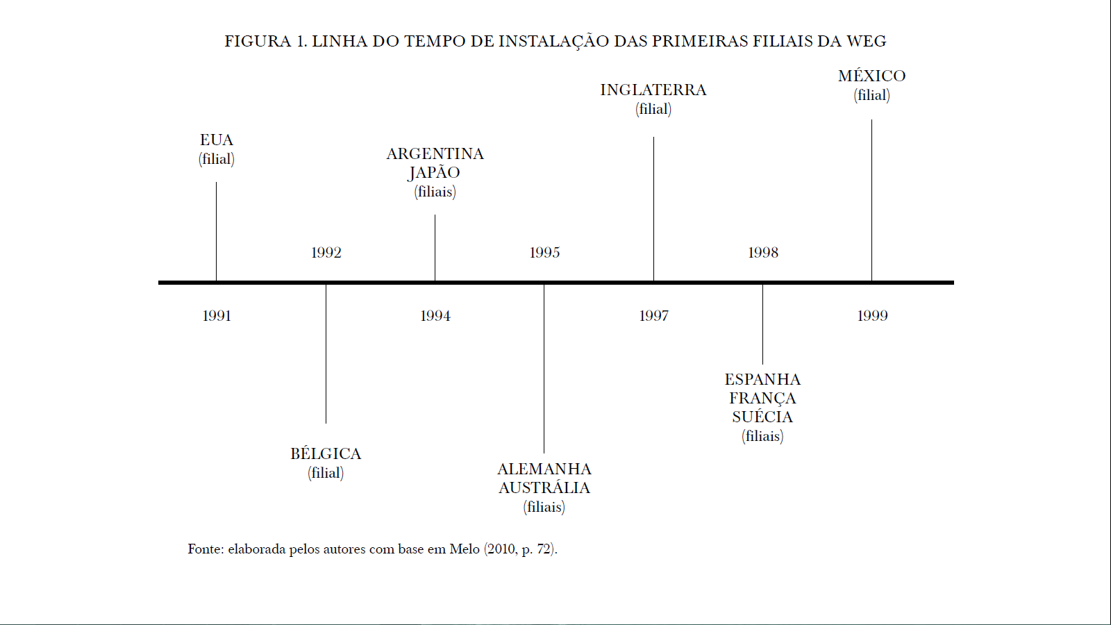 O gráfico 1 possibilita visualizar como se deu o processo de internacionalização da Weg a partir das diferentes fases vividas, desde o início das exportações, da busca de novos mercados, da implantação de filiais comerciais e, por fim, da construção e aquisição de fábricas.