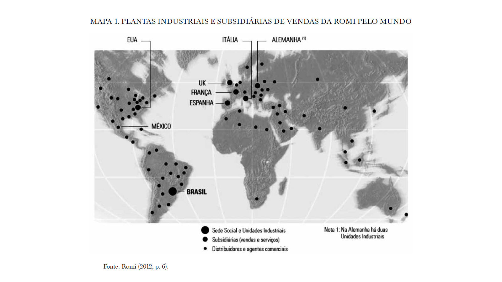 No mapa 1 é possível visualizar as plantas industriais e as subsidiárias de vendas da Romi pelo mundo. Na tabela 1 (ver anexo) há um resumo dos investimentos da Romi em controladas e coligadas no exterior em 2012.