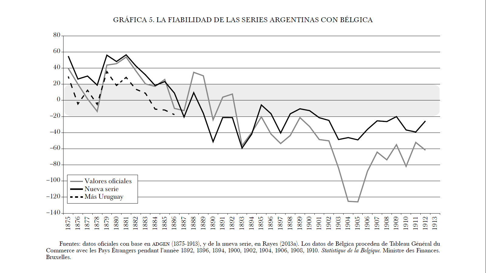 La banda sombreada en gris indica los márgenes de 20% en los que las discrepancias entre series podrían justificarse a través de los fletes u otros costes. En los primeros años del periodo se observa un signo inesperado que indica una sobrevaloración argentina o una infravaloración británica. En este último caso, podría tratarse de un problema de asignación geográfica relacionado con el puerto de Montevideo, es decir, la estadística inglesa pudo asignar como uruguaya mercadería que era argentina durante la década de 1880. Platt (1971) subraya la importancia de los problemas asignativos en las estadísticas británicas anteriores a 1900: "Before the improvement of the port of Buenos Aires, late in the nineteenth century, a substantial proportion of Argentine imports was transhipped from ocean steamers at Montevideo, but the new docks reversed the flow, so that Uruguayan imports might now arrive through Buenos Aires" (pp. 119-120). Para poder verificar este punto hemos añadido los datos de las exportaciones uruguayas a la estadística británica en los primeros años del periodo 1875-1893. Ello mejora sustancialmente el problema de la sobrevaloración, lo que indica que una parte importante de esta discrepancia podría, efectivamente, ser atribuida al error asignativo en la estadística británica. Este resultado reafirma el obtenido por Carreras-Marín y Badía-Miró (2008), según el cual las estadísticas latinoamericanas tendrían niveles razonables de fiabilidad en cuanto a la distribución geográfica de su comercio, mientras que las estadísticas europeas adolecerían de sistemáticos sesgos en la asignación geográfica tendentes a sobredimensionar los principales puertos de las rutas transoceánicas.