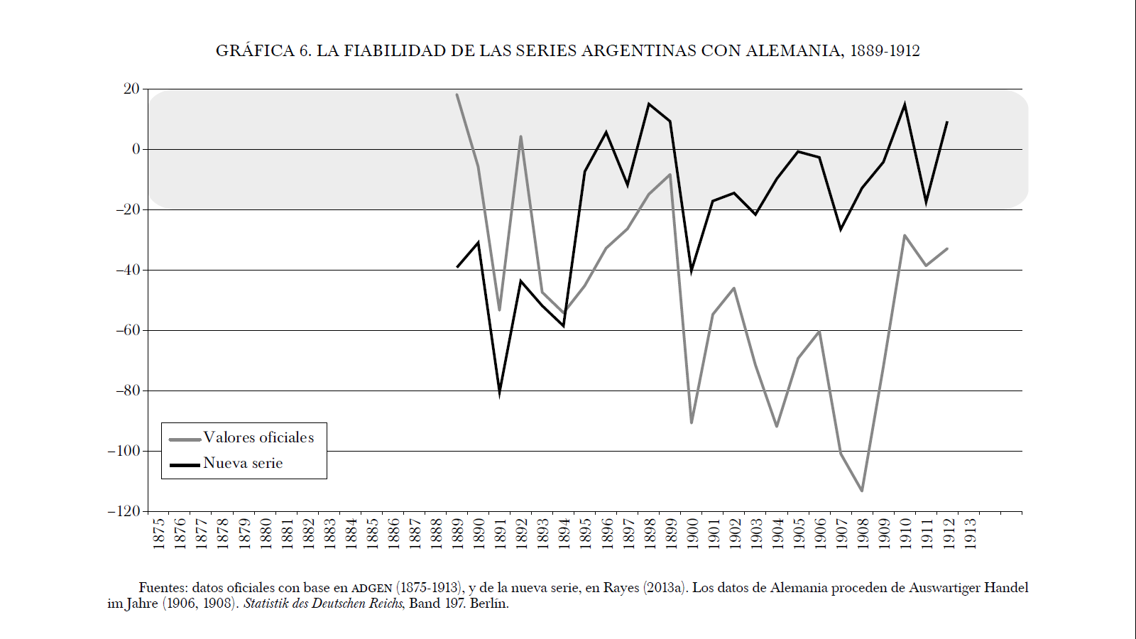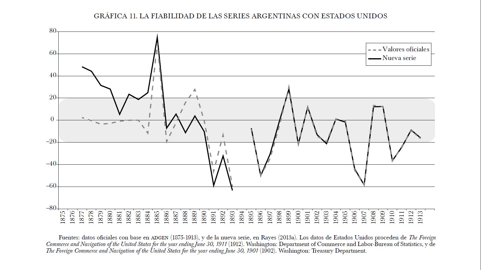 Desde 1894, el problema del signo positivo desaparece y ambas series presentan el signo esperado, potencialmente explicadas a través de los precios CIF . En esta segunda parte de la gráfica, la serie corregida resulta claramente más aceptable, al separarse menos de la serie británica y mantener un comportamiento relativamente más estable, en comparación con la serie oficial argentina. Aunque ambas series mejoran su fiabilidad desde la década de 1890 hasta el preludio de la primera guerra mundial, la nueva serie se sitúa en márgenes marcadamente mejores a los de la serie oficial.