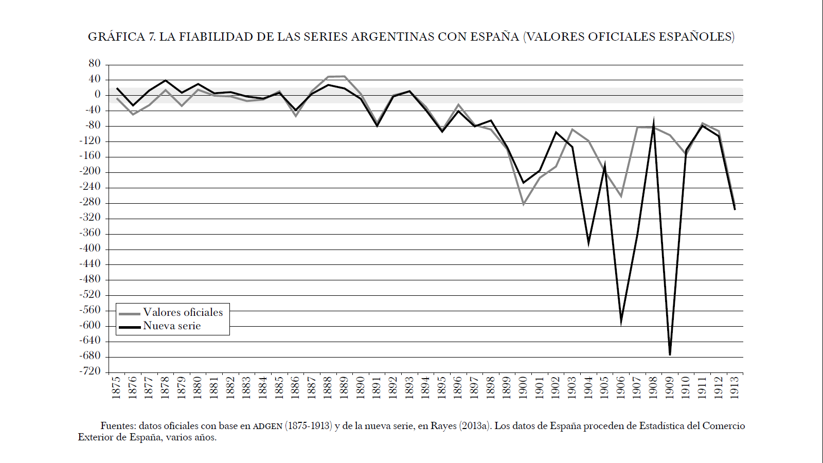 Hay que considerar que los porcentajes de las discrepancias estadísticas entre España y Argentina se refieren a valores menores en términos relativos, así que aunque estos sean elevados, los montos totales distan considerablemente de los valores del comercio británico, francés, belga o alemán (véase gráfica 7). En la última década del periodo se observa una agravación de las discrepancias que afecta tanto a la nueva serie como a la oficial. Si lo dejáramos así el resultado sería claramente negativo para la estadística argentina, con o sin correcciones. No obstante, cabe destacar que las series oficiales españolas han sido objeto de serias críticas y, por ello, se han reestimado a partir de la información de los principales socios comerciales (Prados de la Escosura, 1986).