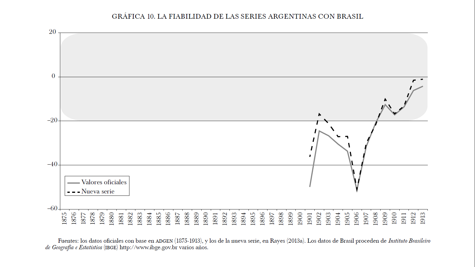 Para el caso de Brasil, sólo se dispone de datos en el periodo 1901-1913 (véase gráfica 10). Las distancias entre la serie oficial y la nueva no son demasiado relevantes y ambas se mantienen en bandas más que razonablemente aceptables, por debajo de 20% en la mayor parte del periodo. La proximidad geográfica y la ausencia del comercio "a órdenes" probablemente sea la explicación de la menor incidencia de los errores asignativos entre sus estadísticas. El resultado razonablemente fiable de los datos de comercio con Brasil refuerza la hipótesis de que frecuentemente los problemas de fiabilidad se derivan de errores de asignación geográfica con los socios comerciales geográficamente más distantes.