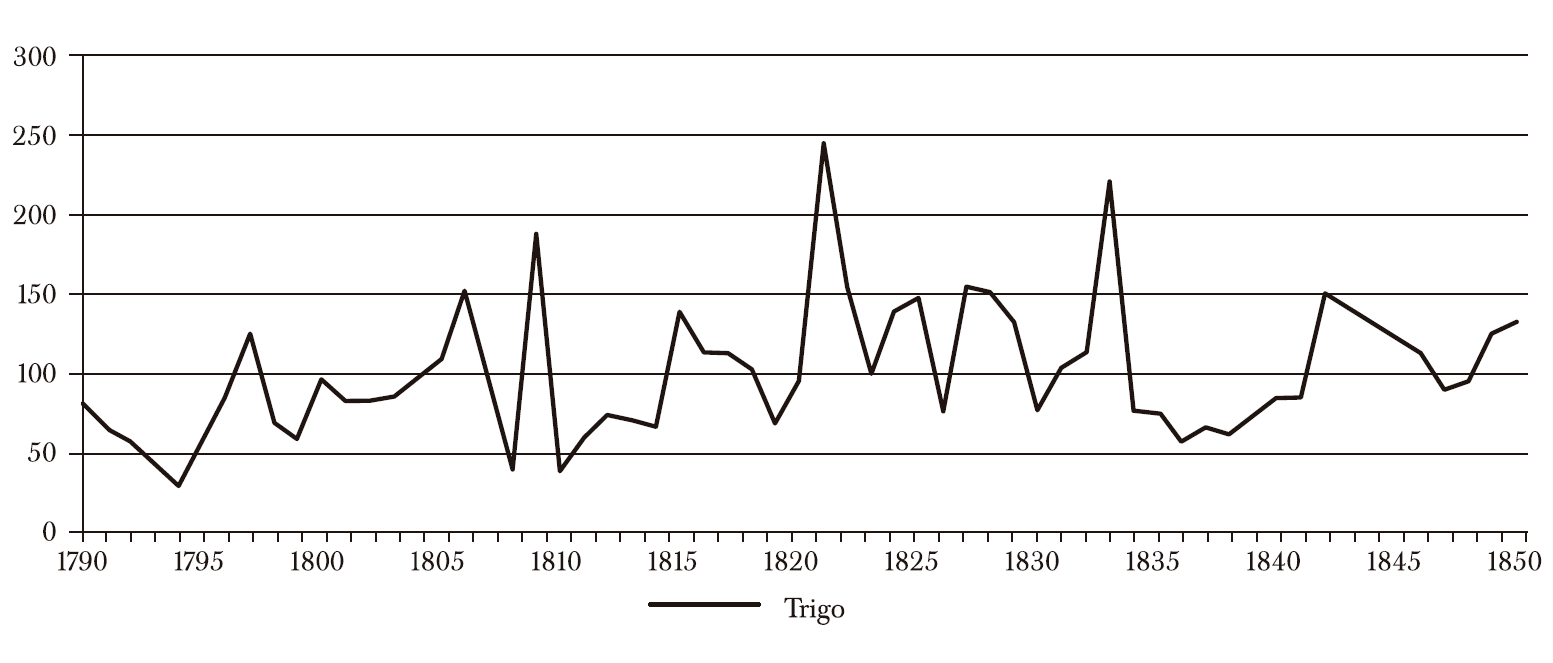Para construir la serie del trigo se tomaron los precios del cereal anotados en la contabilidad del convento de San Carlos. El cereal ingresaba periódicamente al convento de en calidad de limosna recogida en las estancias y chacras de las cercanías y después vendía a los acopiadores y comerciantes locales.33 Debido a que la fuente no permite discriminar los costos de flete, la serie obtenida no incluye este coste.34