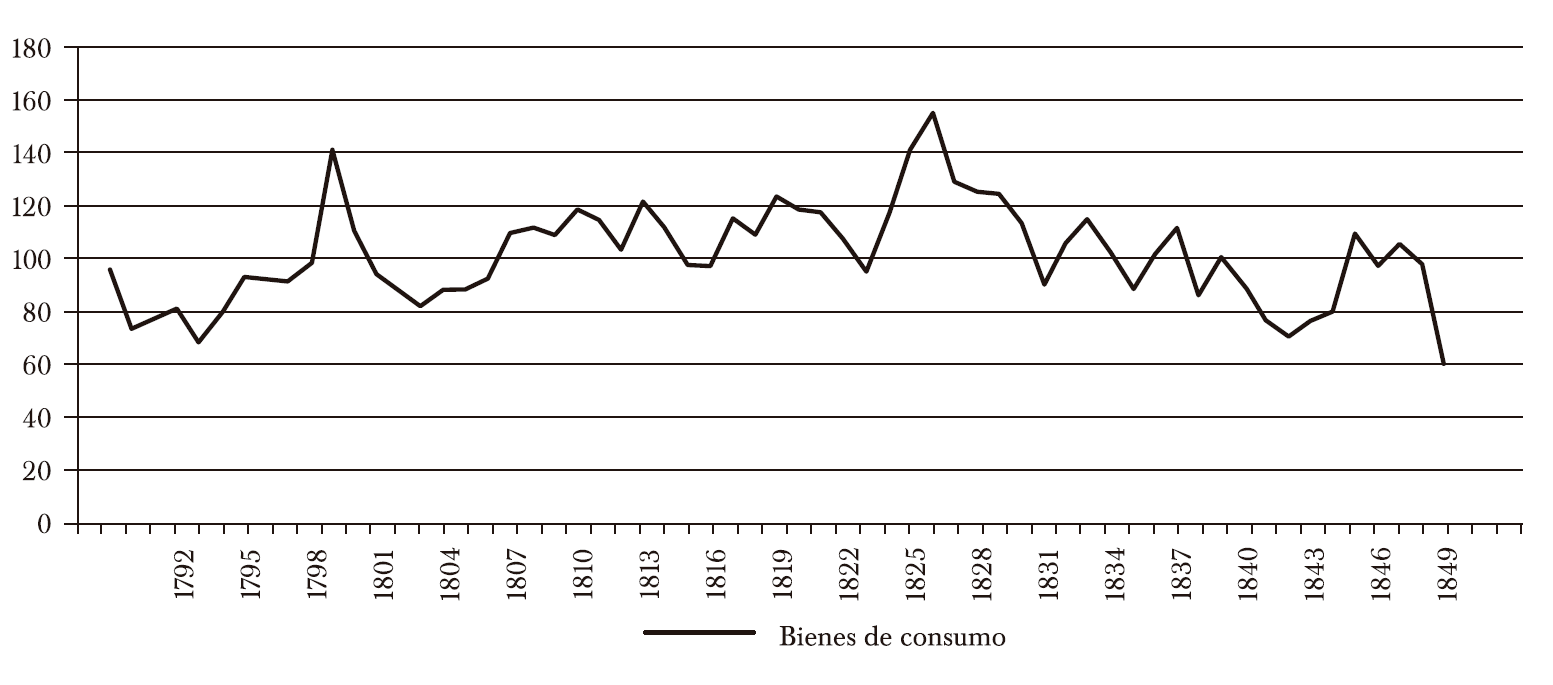 Los estudios que han examinado la evolución de los bienes de consumo regionales e importados sostienen que los precios de los bienes con fuerte participación dentro de los consumos domésticos experimentaron primero un ciclo de retracción (desde 1810 hasta mediados de la década de 1820), registrando luego fuertes fluctuaciones como resultado de ciclos cortos de alza originados por turbulencias temporarias en la oferta de bienes regionales originadas primero por la guerra revolucionaria y a partir de 1820 por las interrupciones temporarias del comercio (bloqueos y conflictos bélicos internos) (Assadourian y Palomeque, 2003). En el largo plazo que va desde la revolución a las décadas de 1840 y de 1850, la trayectoria de los precios de los bienes de consumo importados fue marcadamente descendente. No obstante, faltan investigaciones sistemáticas que examinen críticamente las dimensiones y la intensidad de la demanda de bienes importados en los mercados provinciales del Litoral, sobre todo después de 1820.