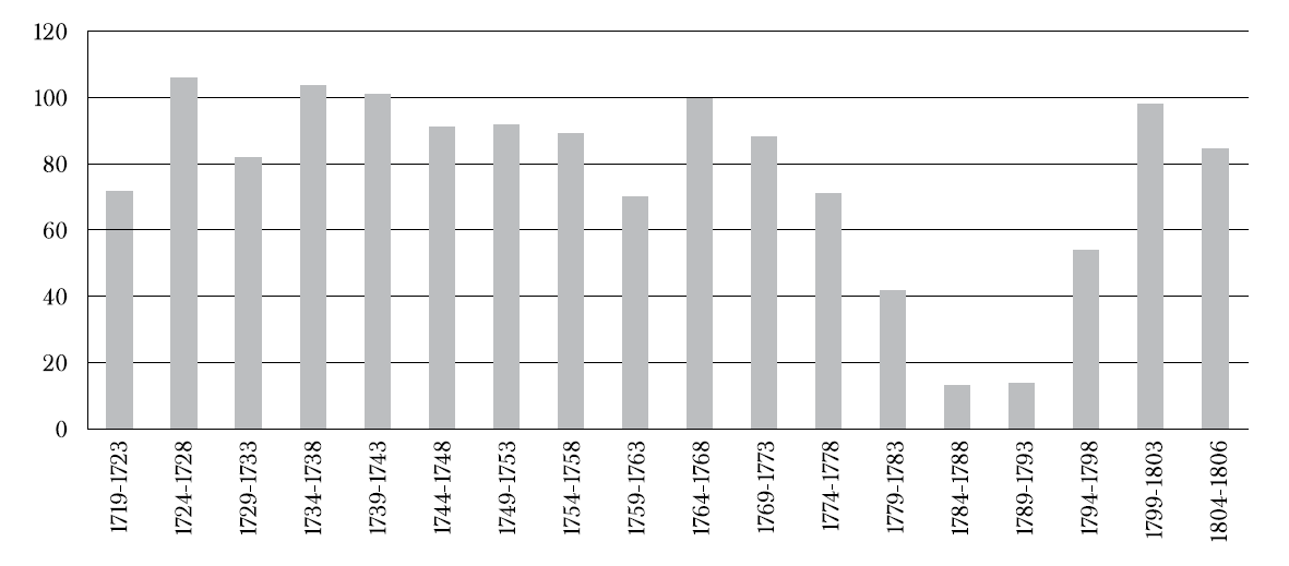Figure 2: Ratio of remittances to coinage of national gold coins (1719-1806) (percentage)