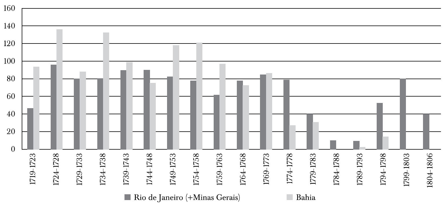 Sources: Rio de Janeiro, periods 1703-1767 and 1797-1807, Soetbeer (1880). For the period 1768-1796, “Meio circulante”, 1883; for Minas Gerais, Boxer (1962); for Bahia, AHU_CU_Bahia_CA, doc. 19715.