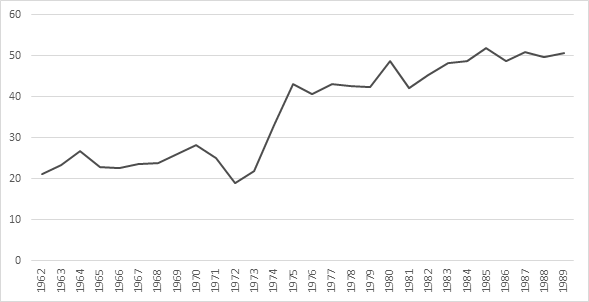 El indicador se mantiene entre 20 y 30% en los años sesenta, crece netamente entre 1973 y 1975, y luego conserva una tendencia creciente hasta 1989. El incremento del precio del azúcar en el mercado libre en 1973, que se multiplica por tres en un solo año, y el cambio metodológico en 1977 (Mesa-Lago y Pérez, 1985, p. 11), con el cual se reducen los dobles conteos en el PSG, son dos factores exógenos que contribuyen a causar el fuerte aumento entre 1972 y 1975. Sin embargo se pueden apreciar dos etapas: en la primera (hasta 1972) el índice se mantiene bajo y estable; en la segunda, se multiplica por dos, y muestra una tendencia creciente. Esto se explica con el proceso de integración en el CAME que comenzó precisamente en 1972, la autocrítica del gobierno cubano sobre la etapa “idealista” de los años sesenta, y la alineación al bloque socialista guiado por la Unión Soviética del cual Cuba había tratado de prescindir en la primera década.