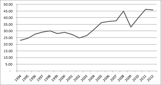 | 1994 | -0.25 | 2013 | -0.39 |