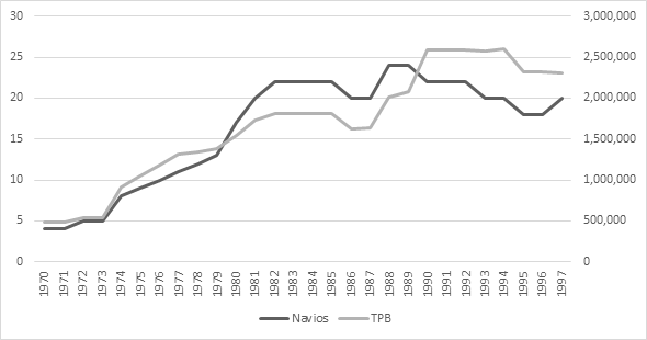 Concomitantemente à expansão da frota própria, também aumentava o número de trabalhadores na companhia, tanto para os embarcados com os que atuavam na administração direta. Em 1970, eram 371 trabalhadores, passando para 1 020 em 1979, ou seja, quase triplicou o efetivo (ver gráfico 2). No início da década, eram apenas quatro navios, no final já eram treze. Tanto um petroleiro de 130 000 TPB como um graneleiro de 53 500 TPB exigiam uma tripulação de aproximadamente 40 homens (Superintendência Nacional da Marinha Mercante, 1973-1979).