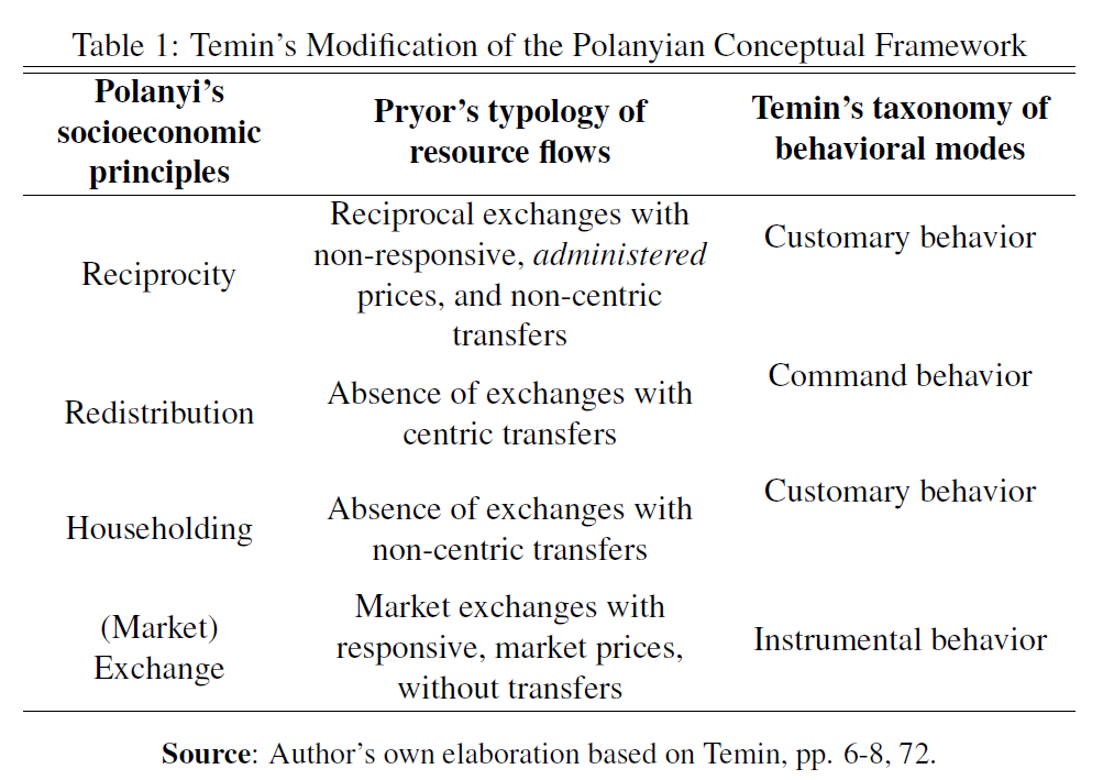 In the opening chapter, “Economics and Ancient History”, Temin explores what the virtues and the vices of models for ancient economic history can be. Temin asserts that “no model is good in the abstract; it is better or worse than an alternative” (p. 6). Accepting that Karl Polanyi set the terms of the debate on allocation mechanisms long ago, Temin reconsiders Polanyi’s socioeconomic principles of reciprocity, redistribution, householding and exchange, criticizing their lack of conceptual precision. He substantiates the Polanyian framework with a typology of resource flows developed by the comparative economist Frederick L. Pryor in 1977 and his own taxonomy of behavioral modes formulated in the 1980’s (see Table 1).